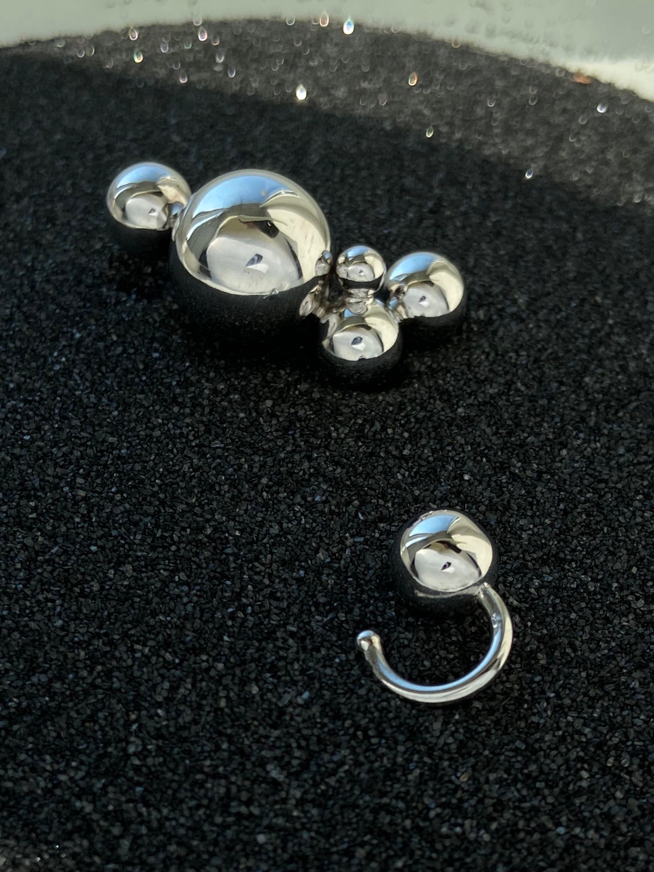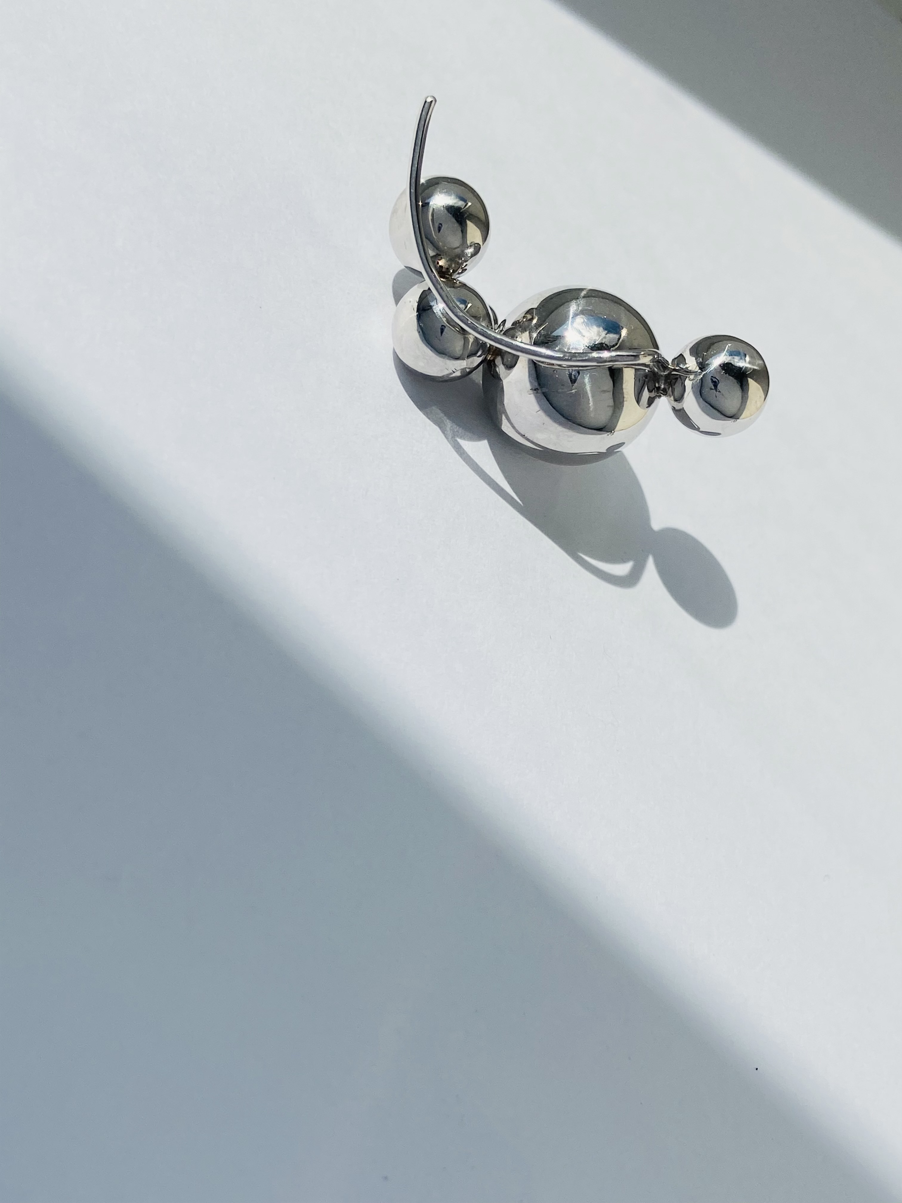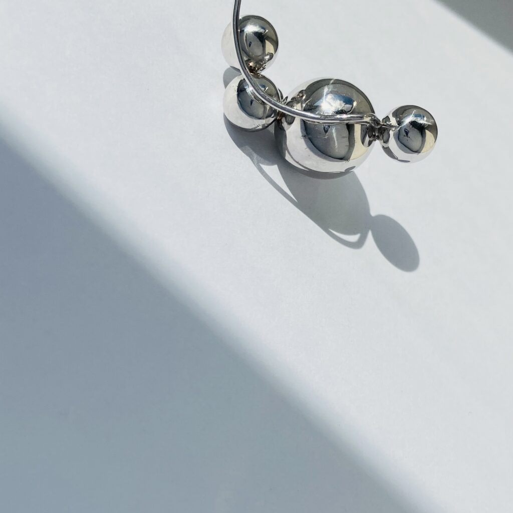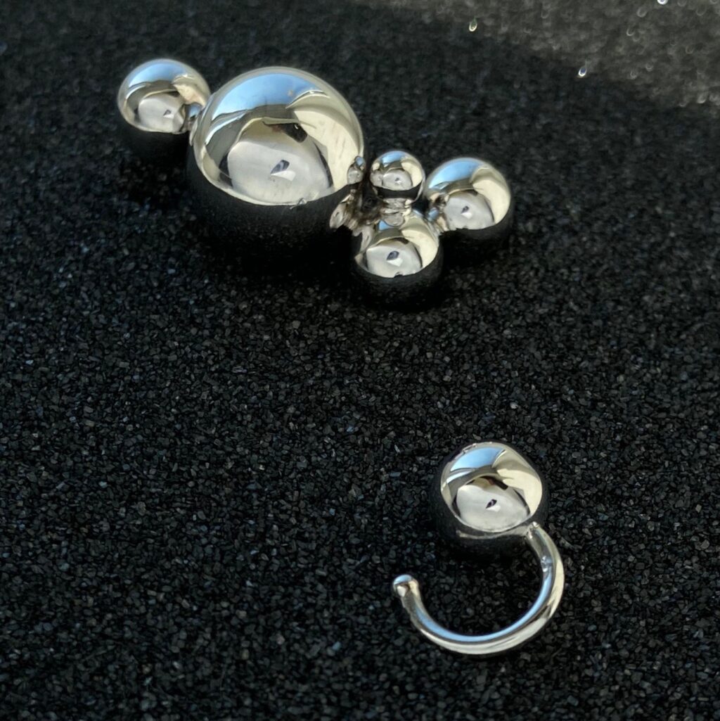 Набір із сережки-зажиму і каффи з кульками різного розміру що імітують абстрактну молекулу.